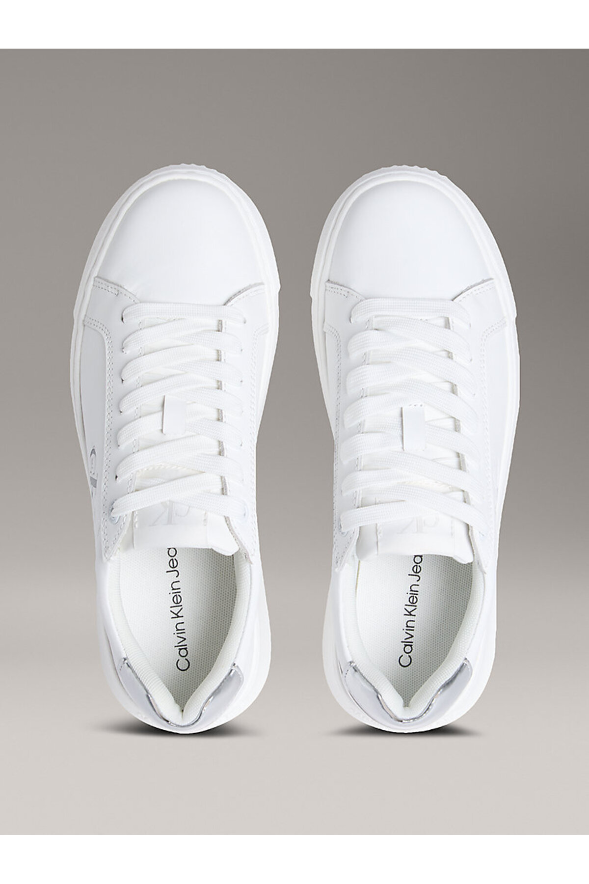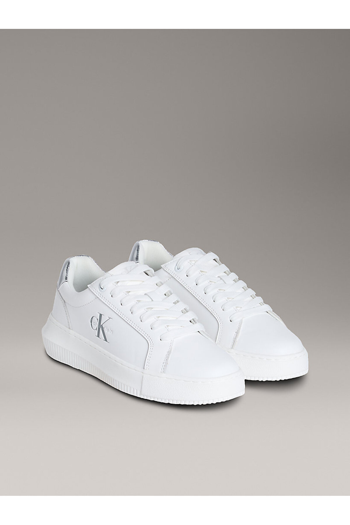کفش زنانه YW0YW01876-02R سفید با رویه چرم رنگ نقرهای و زیره ضخیم از برند Calvin Klein به طور مستقیم از نمایندگی رسمی این برند در ترکیه خریداری و به همراه فاکتور فروشگاه اصلی ارسال خواهد شد.